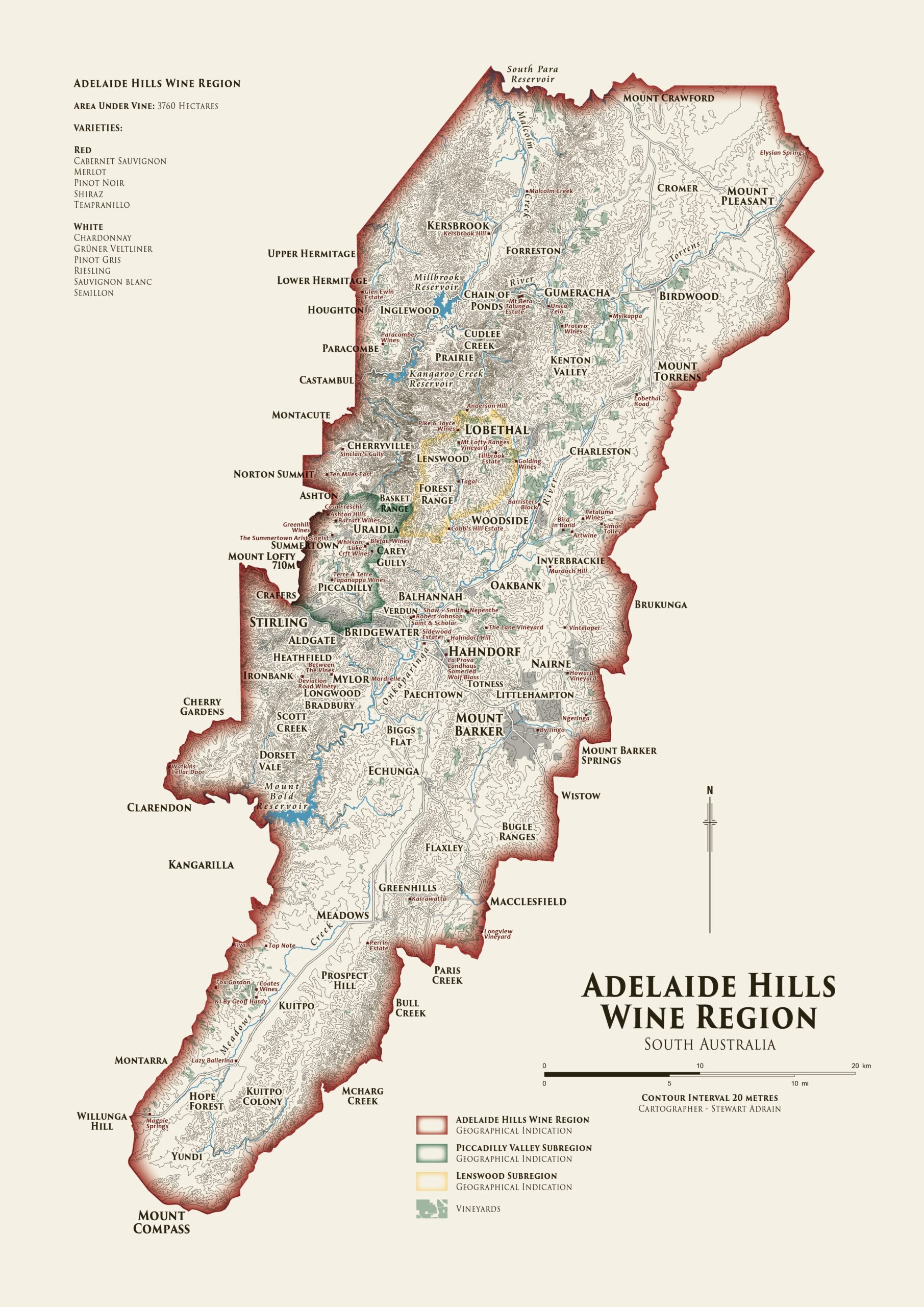 The site for the ARRIVO vineyard in Gumeracha in the Adelaide Hills is unique. Located at an altitude of between 450 and 480 metres at the very crest of the of the slope above the original nursery block, it is steep and rocky with a north-north-westerly aspect, reminiscent of many Nebbiolo vineyards in Piedmont – a true Bricco Mezzogiorno . From the very first time he visited the vineyard, Peter had noted that the top of one of the north west-facing slopes, which was quite steep and very rocky in places, had not been planted with other vines. This was the ideal site for his vineyard, and the more he looked at other potential sites in the Adelaide Hills and elsewhere, the more convinced he became.