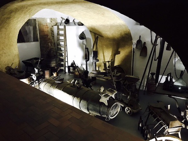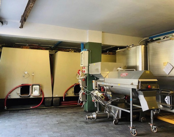 I love the contrast in the two images below with the old school winemaking kit and the modern concrete fermenters and destemmer.
