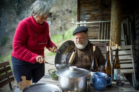 From the incredible farm on top of a cliff with on access aside a walk (including a chain link section on the edge of the cliff with 30 centimetre footway on rocks) or an ancient cable car that feel down in 1978. Incredible biodynamic estate too, with mixed agriculture, high up at 800 to 900 metres above sea level. Wild ferment, no fining or filtering.