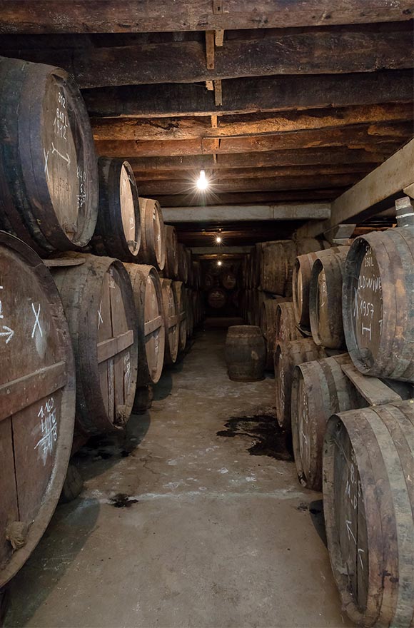 The word “canteiro” derives from the name of the traditional supporting beams on which the American oak casks are placed. This unique process consists in the ageing of the wines in seasoned oak casks for a minimum period of four years. The casks are never 100% full, which allows the wine to slowly oxidize and to transform the primary aromas into tertiary aromas or the classical “Madeira Bouquet” of spices, roasted nuts, dried fruits smoke, amongst many others. On average, the company loses 7% of volume of wine per year through evaporation and it is the winemaker’s decision when to transfer the wine from the hottest attic floors to the lower cooler floors that ensures that this loss of volume is controlled. This natural heating over time also leads to the progressive concentration of the wine. Wines produced in the “canteiro” system are stored in casks by the variety name and vintage year.
