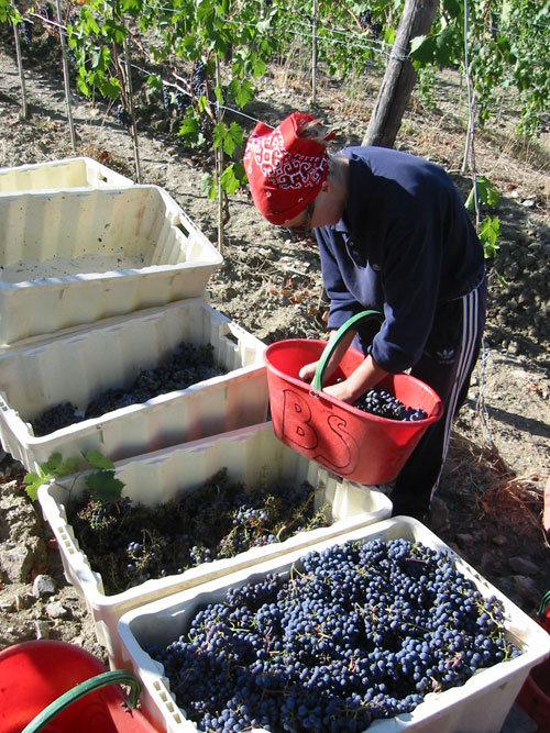 The harvest begins in mid-September and done exclusively by hand. Only the best grapes are destined to the production of Brunello, those from the vineyards that are at least ten years old for the Annata and those at least twenty-five years old for the Riserva. The second choice of grapes is used for table wine, sold in bulk. Only estate-grown grapes and wine vinified, solely, on the premises of the estate are used for production.