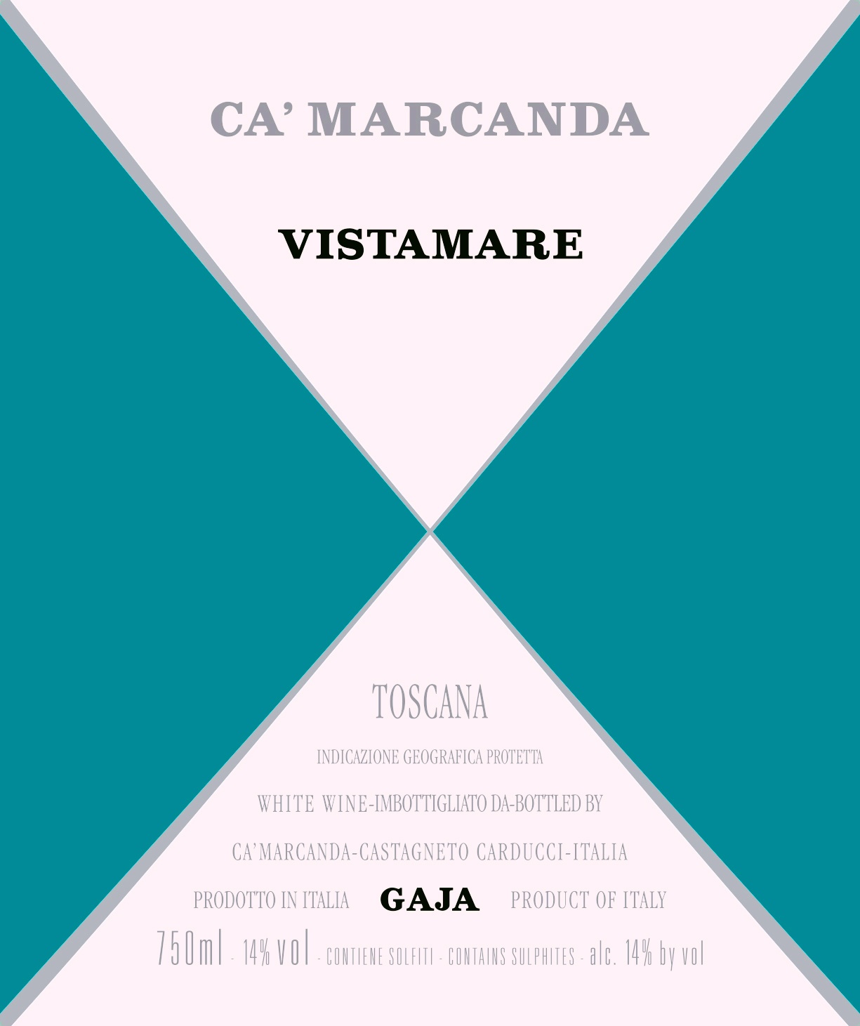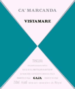 The only white wine produced at Ca’Marcanda is a blend of predominantly Vermentino at 70% then 20% Fiano and 10% Viognier. All varieties are vinified separately. The Vermentino is fermented in temperature controlled stainless steel tanks and the Viognier in barrel. Elevage is for 6 months then blended and bottled. The wine is actually classified as Toscana IGP as the Vistamare vineyard is found outside the Bolgheri DOC in neighbouring Bibbona. The name Vistamare means ‘sea view’ as the site in Bibbona overlooks the Tyrrhenian coastline.