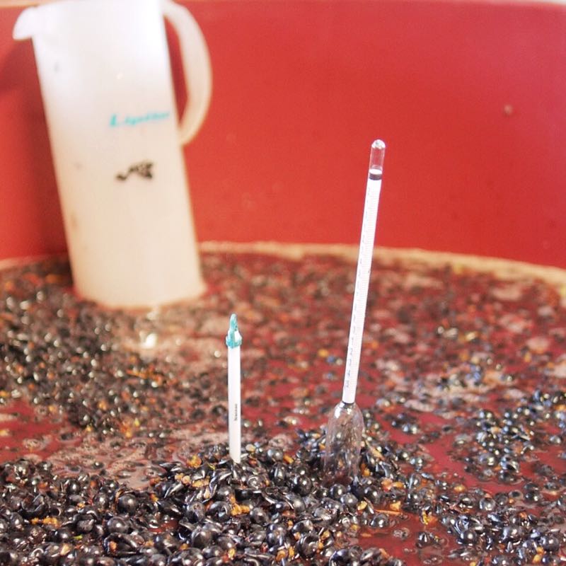 Pics Left to Right: My stalky teabag pokes it’s head up through the vat full of must (crushed grapes) I’ll push it down to expel trapped ear and allow it to steep later! Pushing my stalk teabag to the bottom of the vat! Analysis Done! Temp 18C sugar 12.6Baumé! Most importantly flavour = Yummy & the tannin is ripe! That’s what you get with 17 year old vineyard yielding sub 2 Tonnes/acre, looked after by lots of worms!