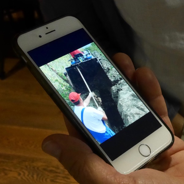 Extreme passion and dedication to quality. Constantly pushing to grow better grapes and make better wine. Seeking harmony, sophistication, purity, layers and layers of aroma and flavour. His vineyards are tended as though they were his children. Yields miniscule. He works to drive the roots of his vines deep into the ground, and, feed them with compost rather than chemical fertiliser. You can see the mid-row trenching and composting below. With great pride he holds tiny bunches of Nebbiolo destined for his Barolo.